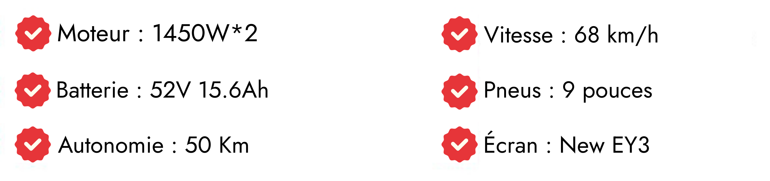 *Autonomie basée sur une charge de 75kg à une température de 25 °C, en roulant à 15km/h à vitesse constante sur un test de route plate.* Sauf indication contraire, les données impliquées dans ce site web sont les résultats de tests internes. * En raison des caractéristiques des batteries au lithium, après une période d’utilisation, la capacité maximale de la batterie diminuera. Les modèles affichés sur ce site Web varieront selon le marché dans différents pays et régions. Le contenu de ce site web est uniquement à titre de référence. Pour les spécifications du véhicule et les informations sur la configuration standard, veuillez vous référer aux informations fournies sur le lieu d’achat réel. * Les images, modèles, performances et fonctions figurant sur cette page ne sont donnés qu’à titre indicatif. Pour plus de détails, veuillez vous référer au produit réel.