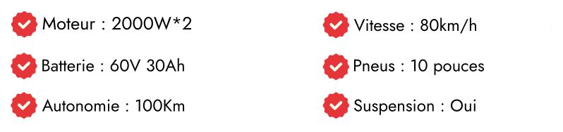 Tout d’abord, elle est équipée de deux moteurs de 2000 W max, soit une puissance totale de 4000 W. Cette configuration permet d’atteindre une vitesse maximale de 80 km/h, offrant des accélérations rapides et une conduite dynamique. La New Victor assure ainsi des performances stables et fiables, même sur des pentes ou routes variées.