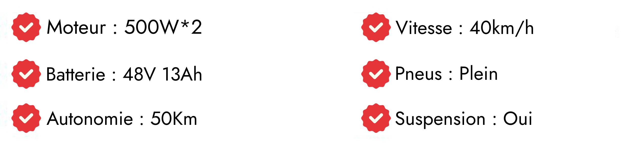 *Autonomie basée sur une charge de 75kg à une température de 25 °C, en roulant à 15km/h à vitesse constante sur un test de route plate.* Sauf indication contraire, les données impliquées dans ce site web sont les résultats de tests internes. * En raison des caractéristiques des batteries au lithium, après une période d’utilisation, la capacité maximale de la batterie diminuera. Les modèles affichés sur ce site Web varieront selon le marché dans différents pays et régions. Le contenu de ce site web est uniquement à titre de référence. Pour les spécifications du véhicule et les informations sur la configuration standard, veuillez vous référer aux informations fournies sur le lieu d’achat réel. * Les images, modèles, performances et fonctions figurant sur cette page ne sont donnés qu’à titre indicatif. Pour plus de détails, veuillez vous référer au produit réel.